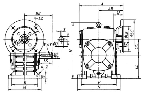 規(guī)格 | 輸入功率/kW | 減速比 | A | AB | BB | CC | H | HL | LL | M | N | E | F | G | Z |