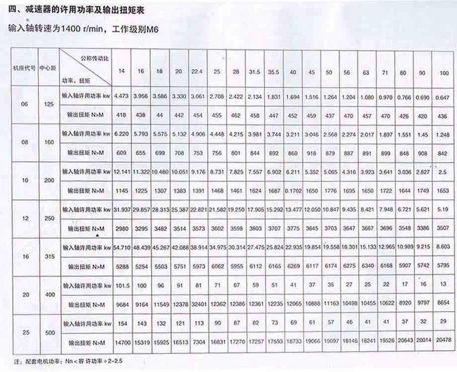 QS型減速器的輸入軸許用功率和輸出轉(zhuǎn)矩(工級(jí)M6)
